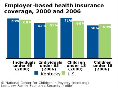 Figures reflect the percent of children under age 18 and the percent of adults under 65 who were covered by employer-based health insurance during at least part of the year.